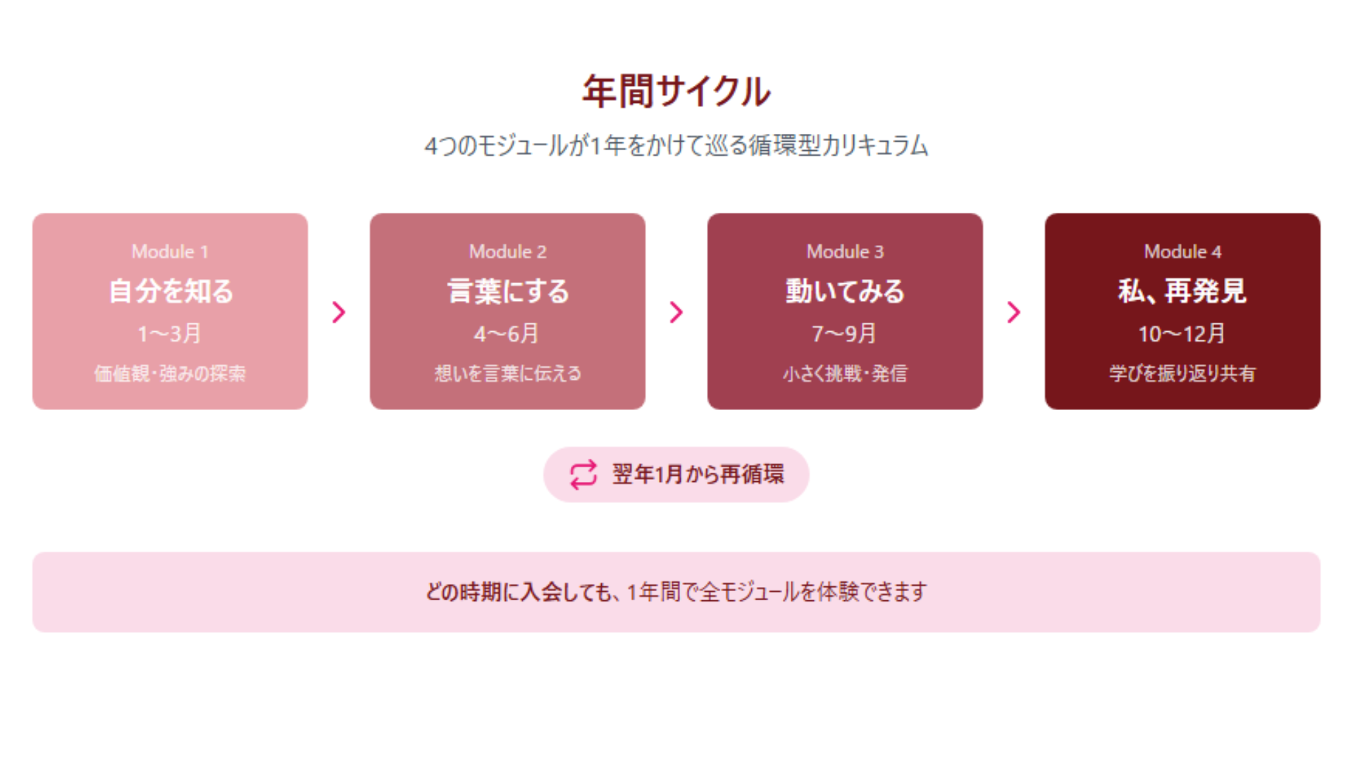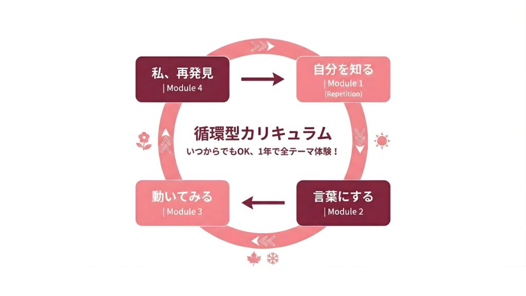 4つのモジュールが1年をかけて巡るので、どのタイミングで入会しても、1年間で全てのテーマを体験できます。